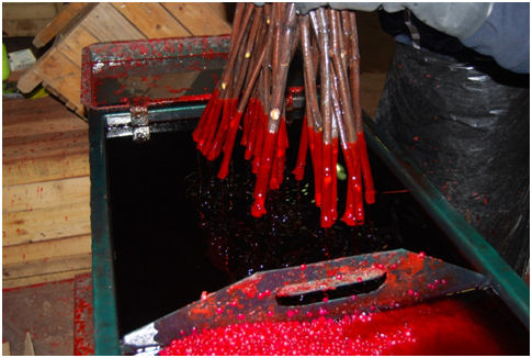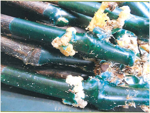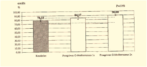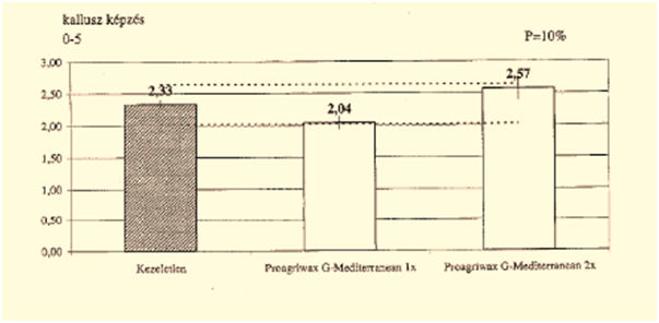 PROAGRIWAX G-MEDITERRANEANSpeciális paraffin szőlőoltványok viaszolására(Engedély szám: 04.2/1388-2/2015 NÉBIH) A PROAGRIWAX G-MEDITERRANEAN egy speciális paraffin, amely a szőlőoltványok viaszolására alkalmazható, mely megvédi az oltványokat a kiszáradástól, kedvezően befolyásolja az oltványok életképességét és eredési százalékát. A PROAGRIWAX G-MEDITERRANEAN egy hiánypótló készítmény, amely eddig nem volt forgalomban a magyar piacon, habár a paraffinozás (hajtatás előtt és után,valamint a téli tárolás alatt) alapvető technológiai eleme a nagyüzemi szőlőoltvány termelésnek. A készítmény kijuttatható: - hajtatás során, fizikai rögzítésként és kiszáradás elleni védelemre - kiiskolázás előtt a friss kallusz szövet kiszáradásának elkerülésére A PROAGRIWAX G-MEDITERRANEAN készítmény tavaszi alkalmazása során megfigyelhető, hogy a szőlőoltványok felületén a paraffin egyenletesen oszlik el, a kezelt felületen gyorsan dermed, ezzel segítve a dinamikus munkavégzést. A megdermedt paraffin a ládázásra és hajtatásra váró oltványok felületén nem maszatolódik vagy csomósodik, ami jelentősen csökkentené a paraffin hatékonyságát. Kiiskolázást követően könnyedén alkalmazkodik a szélsőséges (hirtelen nagy hőingadozás) hőmérsékleti viszonyokhoz. A paraffinozott oltványok felületén repedéseket vagy jelentős megfolyást, megolvadást nem lehet megfigyelni. A termék alkalmazása az oltási kallusz képződésre van leginkább hatással. A talpi kallusz fejlődésére, valamint a hajtás és gyökérnövekedésre Felhasználásának előnyei: Felhasználási javaslat: Javasolt a PROAGRIWAX G-MEDITERRANEAN készítmény lassú (pl. 2 órán keresztül végzett) felolvasztása és a felhasználás alatt a viasz 80 oC-os állandó hőmérsékleten tartása. A paraffin pl. vízköpenyes elektromos paraffinozó berendezésben 76-80 oC kezelési hőmérsékleten az oltványok felületére könnyen, megfolyás nélkül tapad és megfelelő mennyiségben oszlik el, zárt teljes felületet biztosítva. Egy oltványra átlagosan 4,5 gr készítmény felvitele javasolt. Csak a szükséges viaszmennyiséget érdemes melegíteni, mert a többszöri melegítés rontja a készítmény eltarthatóságát. Hajtatás után a kalluszos oltványokat a megolvasztott paraffinba kell mártani a Javasolt a kétszeres paraffinozás, az alany és a nemes vesszők összeoltását követően, majd hajtatás után kiiskolázás előtt az oltványokat újra a PROAGRIWAX |